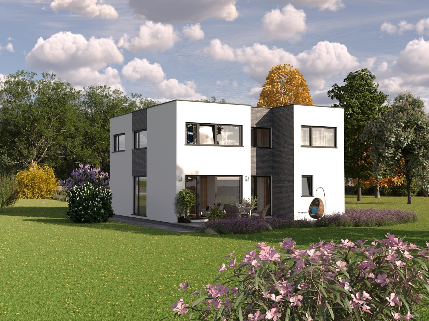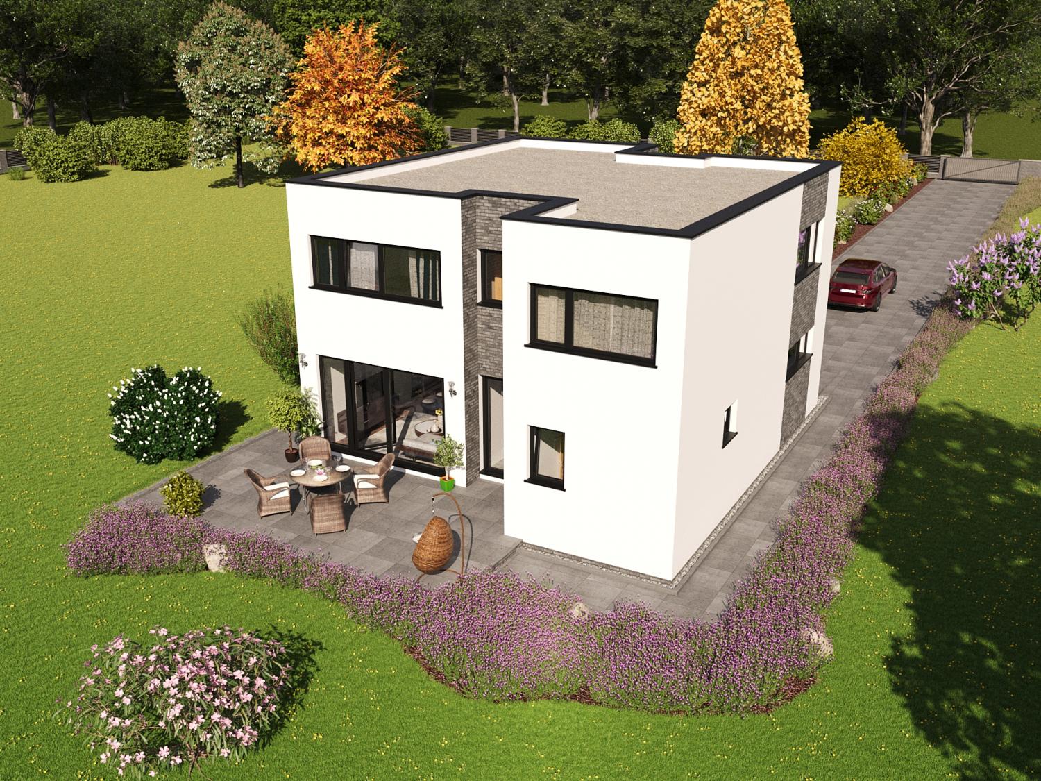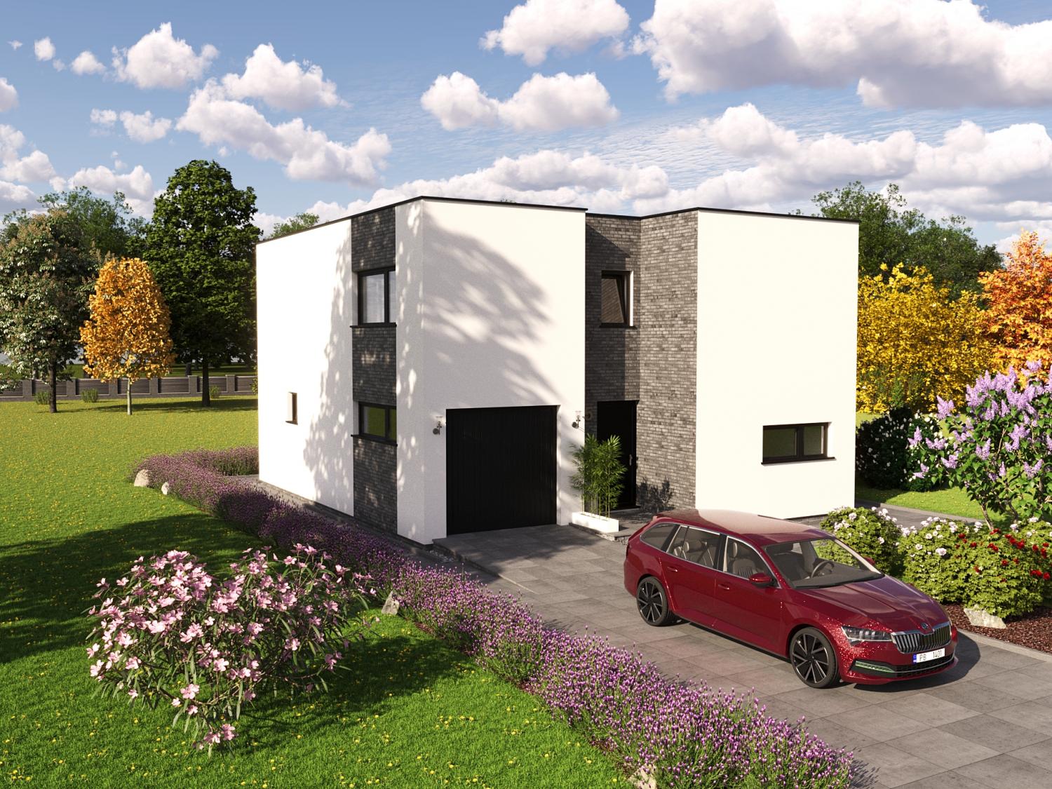 Netradiční, typový, patrový rodinný dům s plochou střechou, konstruovaný technologií montované dřevostavby.